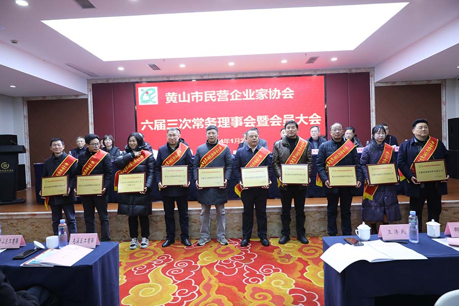 2024年1月26日下午,黃山市民營企業(yè)家協會六屆三次常務理事會暨會員大會在屯溪召開,我公司(副會長)參加了此次大會。會上表彰了10家“黃山市有突出貢獻的民營企業(yè)”和31位“黃山市優(yōu)秀民營企業(yè)家”,并舉行了授牌儀式。我公司被授予“黃山市有突出貢獻的民營企業(yè)家”榮譽稱